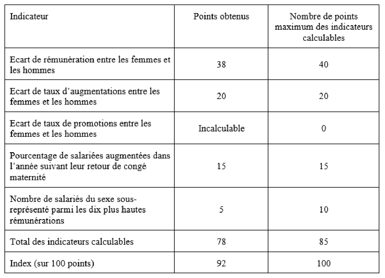 Depuis le décret n° 2021-265 du 10 mars 2021, l’employeur doit publier les résultats de chaque indicateur. Ainsi, au titre de l’année 2025, les notes obtenues pour chaque indicateur sont les suivantes :